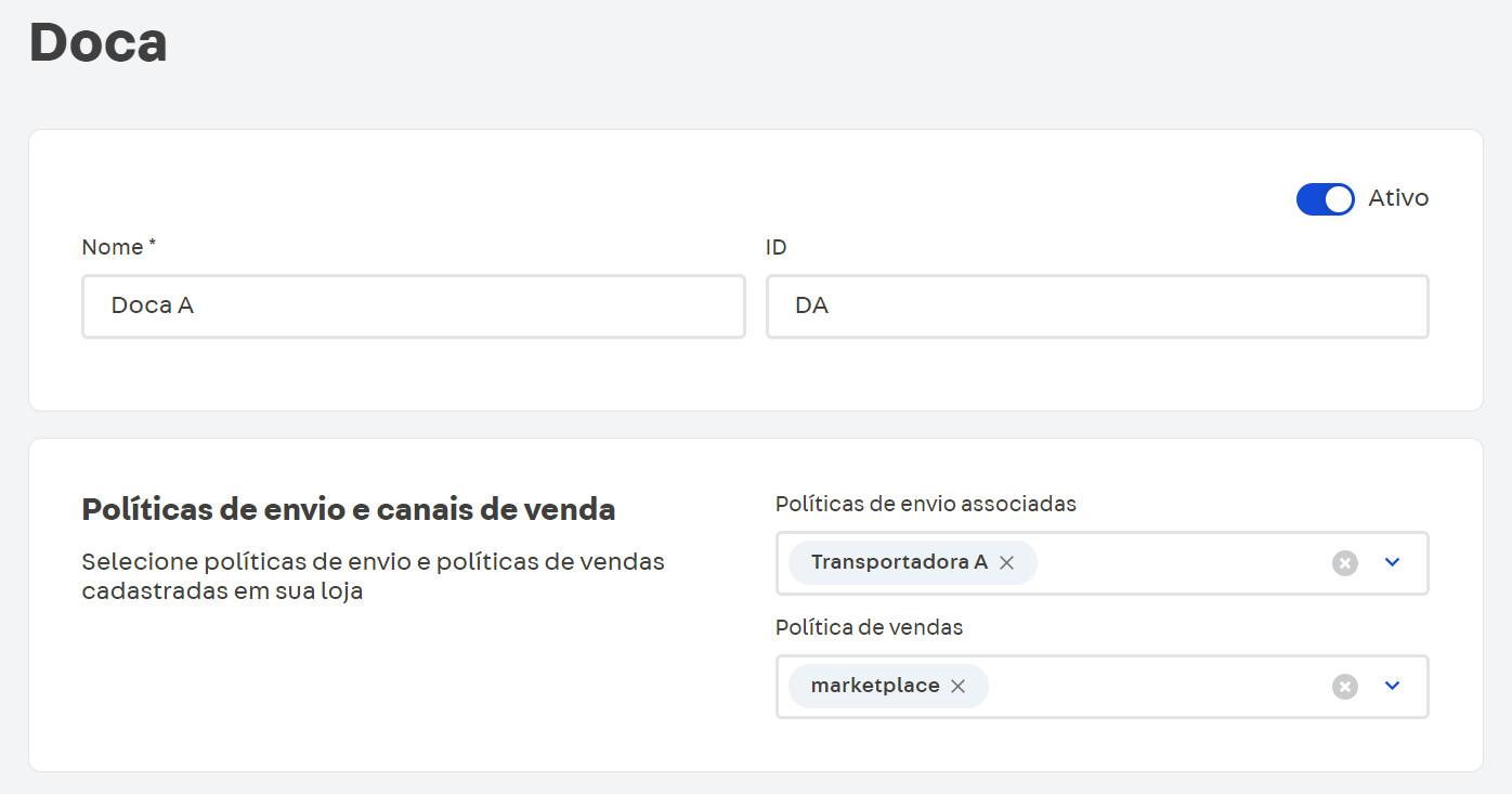No exemplo acima, a doca está associada à política comercial "Marketplace", que serão atendidas pela transportadora "Transportadora A".