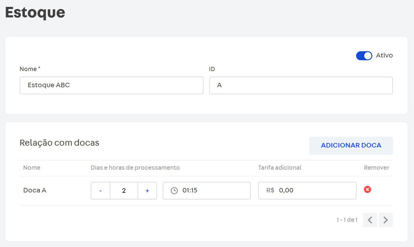 No exemplo acima, o estoque está associado a "Doca A", portanto esse será o estoque que as políticas comerciais vinculadas à "Doca A" utilizarão.