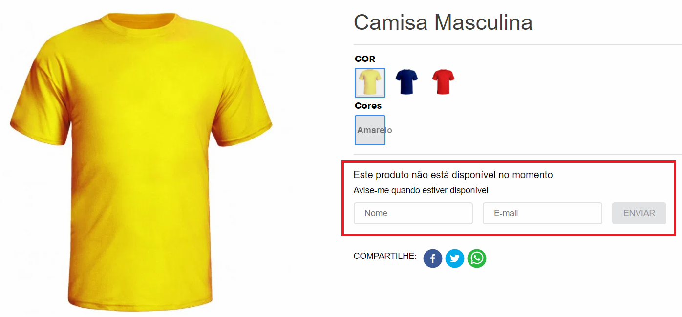 Quando um produto está fora de estoque, o lojista pode optar por disponibilizar para o cliente o Avise-me. Essa funcionalidade permite que os clientes interessados sejam notificados por email quando o item voltar a ficar disponível.