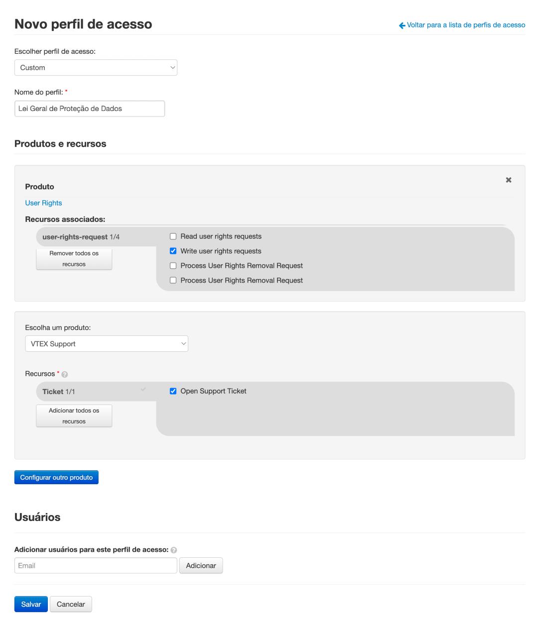 Em seguida, atribua este perfil de acesso ao usuário que será responsável pela solicitação de exclusão de dados de clientes.