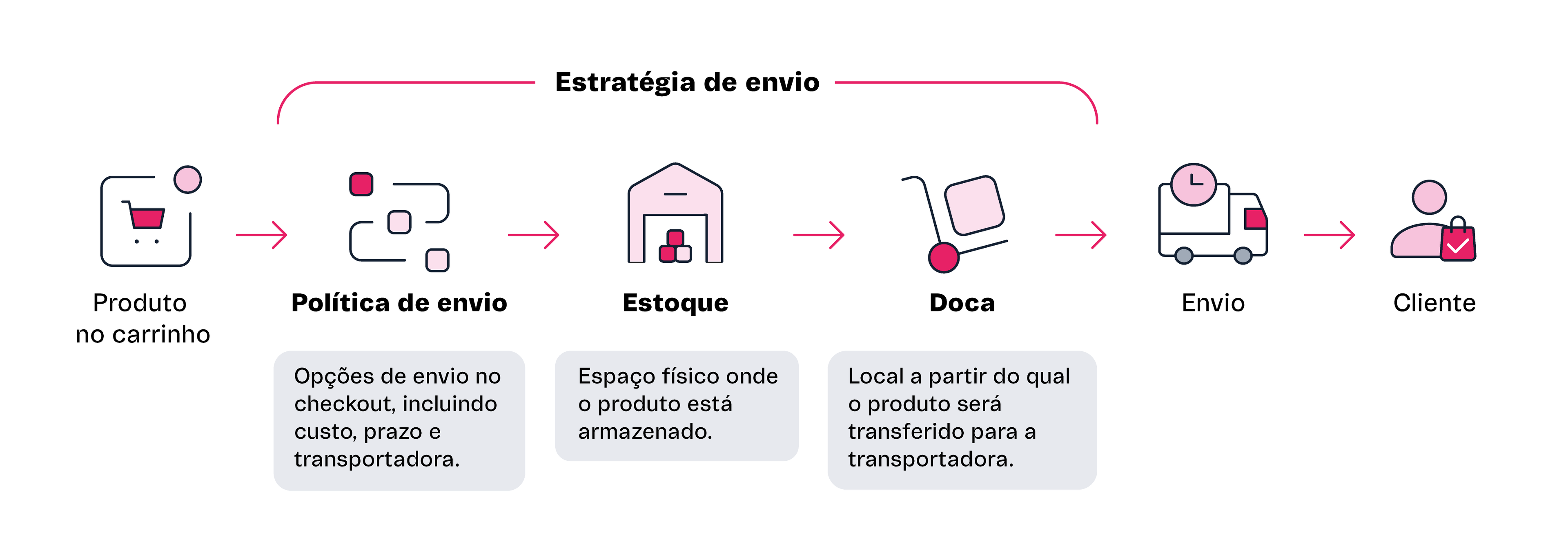 Política de envio é um conjunto de regras e configurações que definem quais opções de envio serão apresentadas aos clientes no checkout. A relação entre política de envio, estoque e doca é o que compõe a sua estratégia de envio na VTEX, conforme a imagem abaixo: