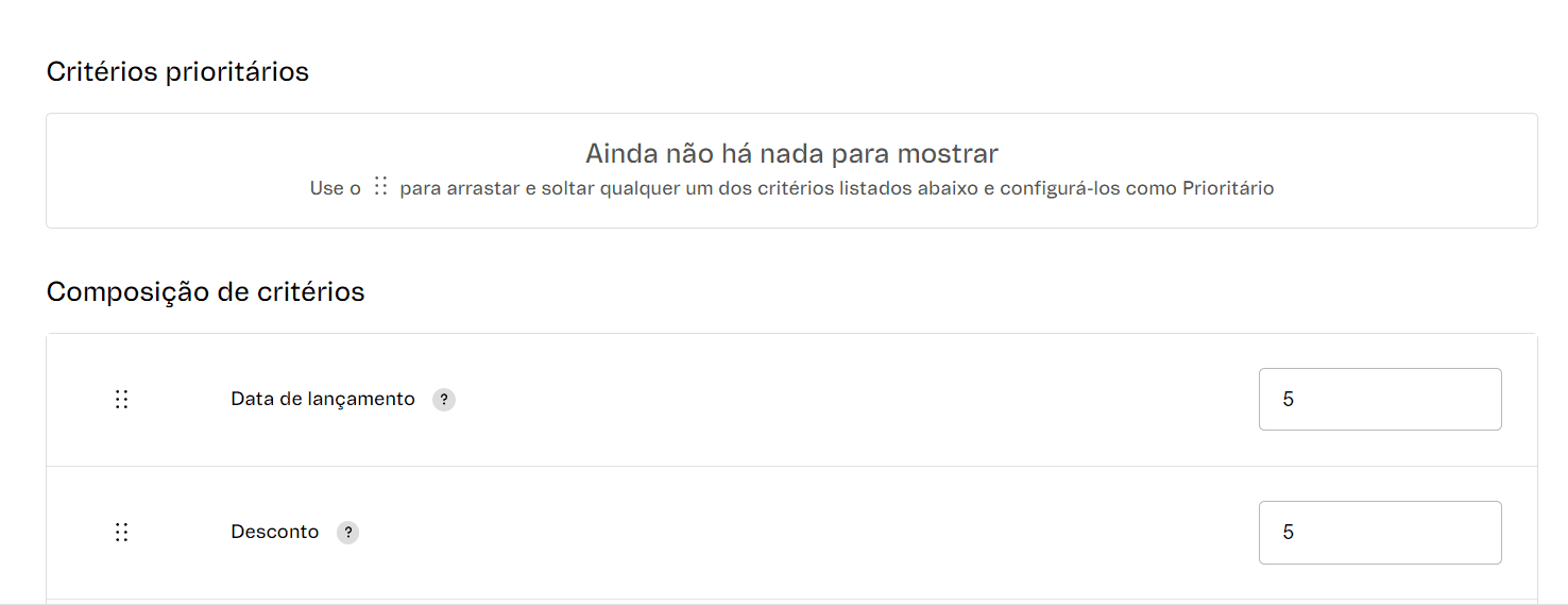 Caso você queira mudar a posição de um critério de Composição de critérios para Critérios prioritários, arraste-o pelo ícone para a área superior, conforme ilustrado na imagem abaixo. Note que quando o critério se torna prioritário, não é mais possível alterar seu peso.