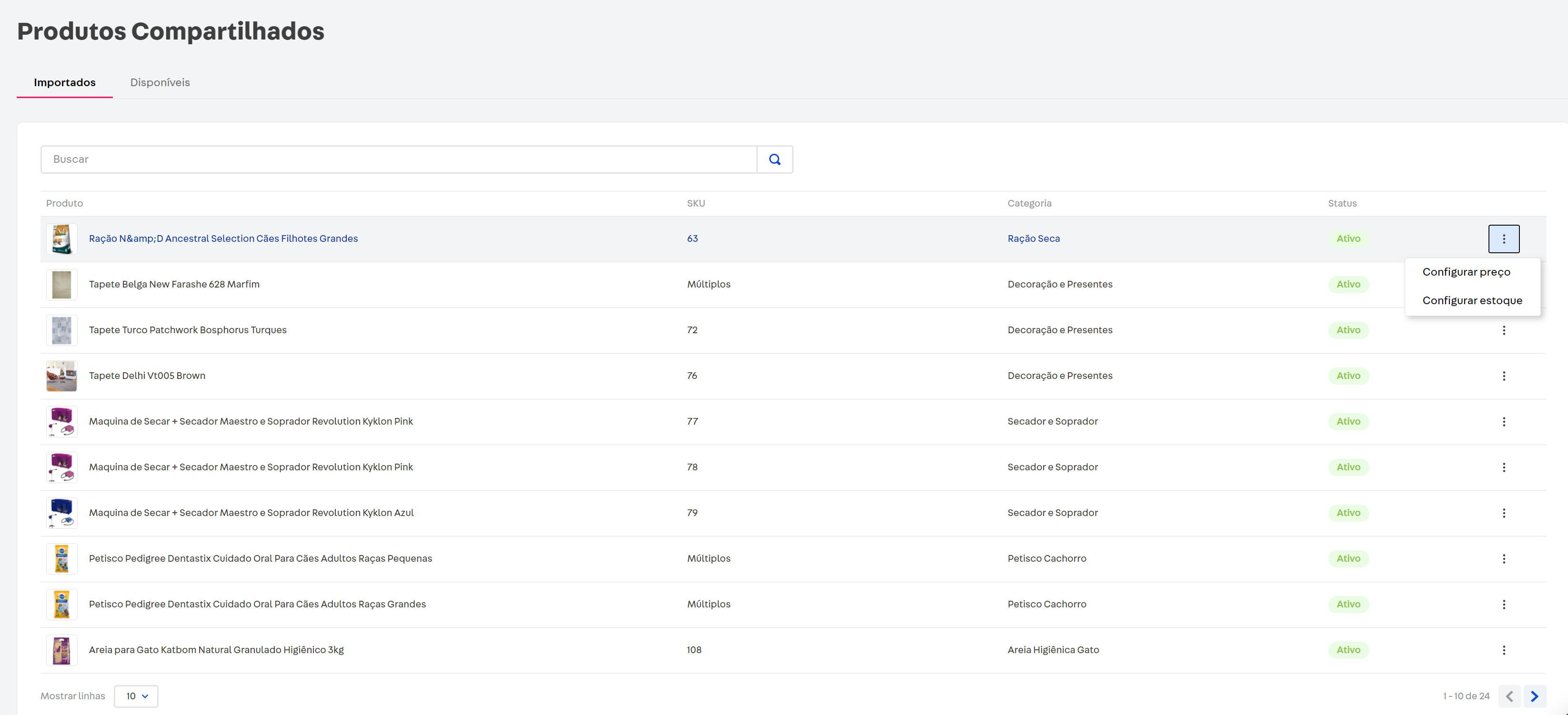 Todos os produtos importados serão incluídos na aba Importados. Os produtos importados mais recentemente também permanecerão listados na aba Disponíveis para o seu controle.