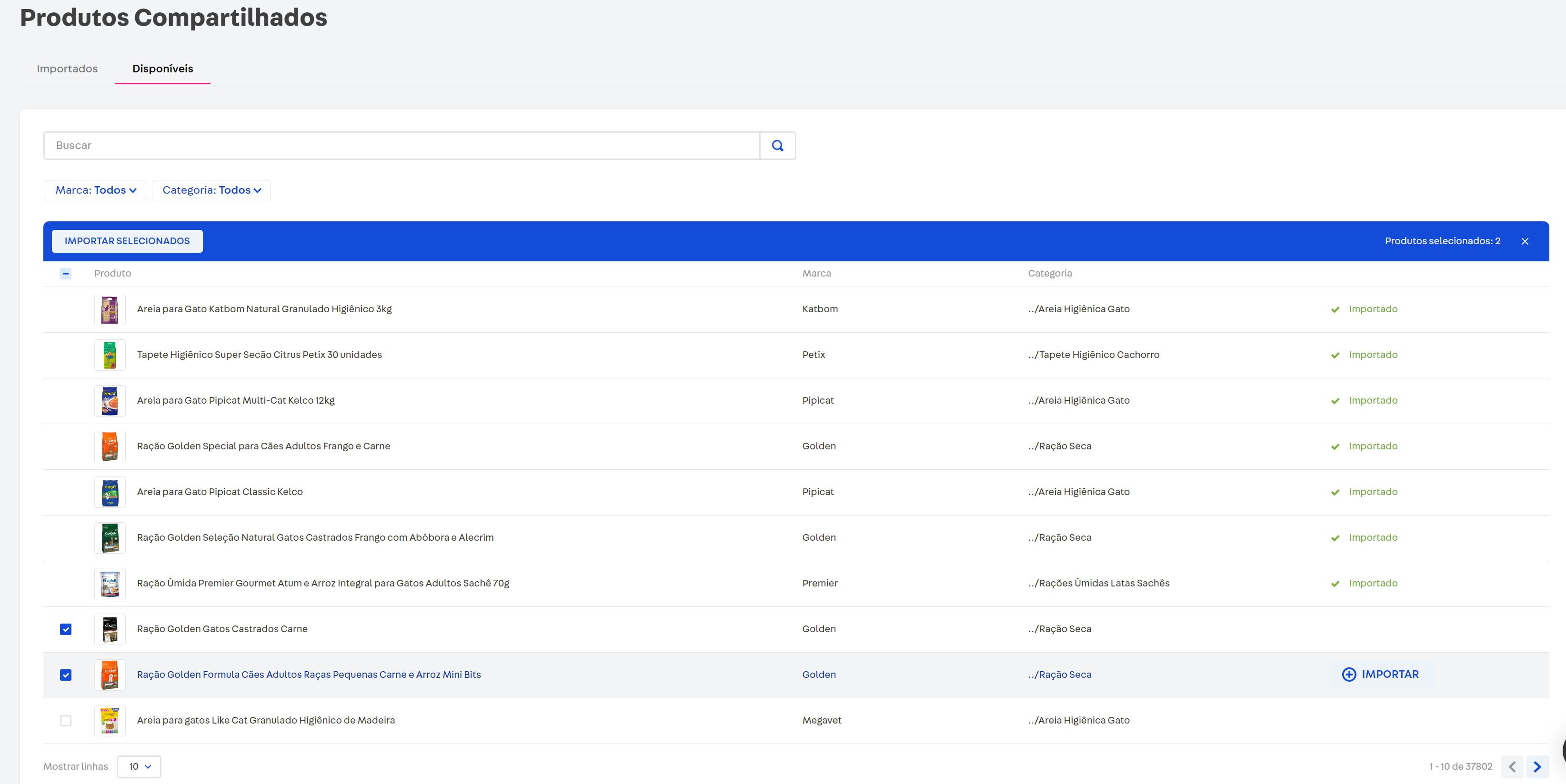 A aba Disponíveis reúne produtos do catálogo do marketplace que foram disponibilizados para que o seller os venda, e que não foram incorporados ainda no catálogo do seller. É possível filtrar os produtos disponíveis por marca ou categoria para agilizar o processo de importação dos produtos selecionados.