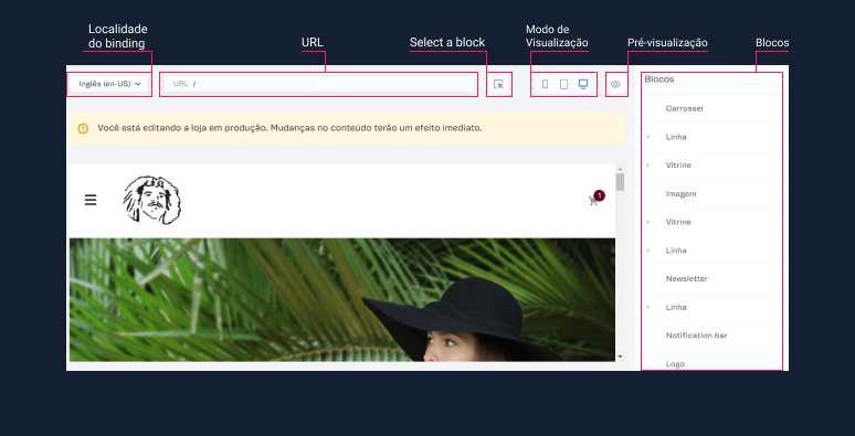 BlocosAdicione e edite blocos - por exemplo, banner, menu e rodapé - para criar e personalizar a frente de loja.